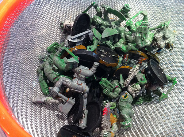 Con el cepillo de dientes iremos, una por una, frotando todas las miniaturas hasta conseguir que la capa de pintura salte de la misma dejando ver el plástico gris original. Tendremos cuidado de las salpicaduras. Usad ropa vieja o un delantal.