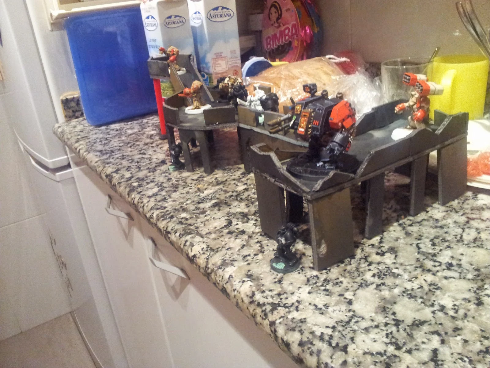 Ahora a ver si encuentro algún otro trozo u otro material para hacerle unas escaleras para poder subir a los sitios y lo pongo sobre una peana texturizada que se disimule con el típico tapete verde que usamos casi siempre...
